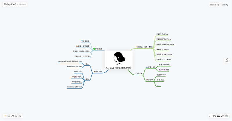 AmyMind是一个轻量小巧的在线AI思维导图工具,无需登录、注册、下载安装,在线打开即用,选中相应节点后鼠标右键便可AI自动生成同级节点或子节点。AmyMind支持多种文件格式,导入freemind格式、markdown文件,导出为Word、PNG、freemind和markdown文件。